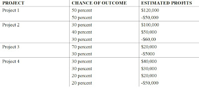 For project 4, we have 30 percent chance to earn $40,000, 30 percent chance to earn $30,000, 20 percent chance to earn $20,000, and 20 percent chance to lose $ 50,000.